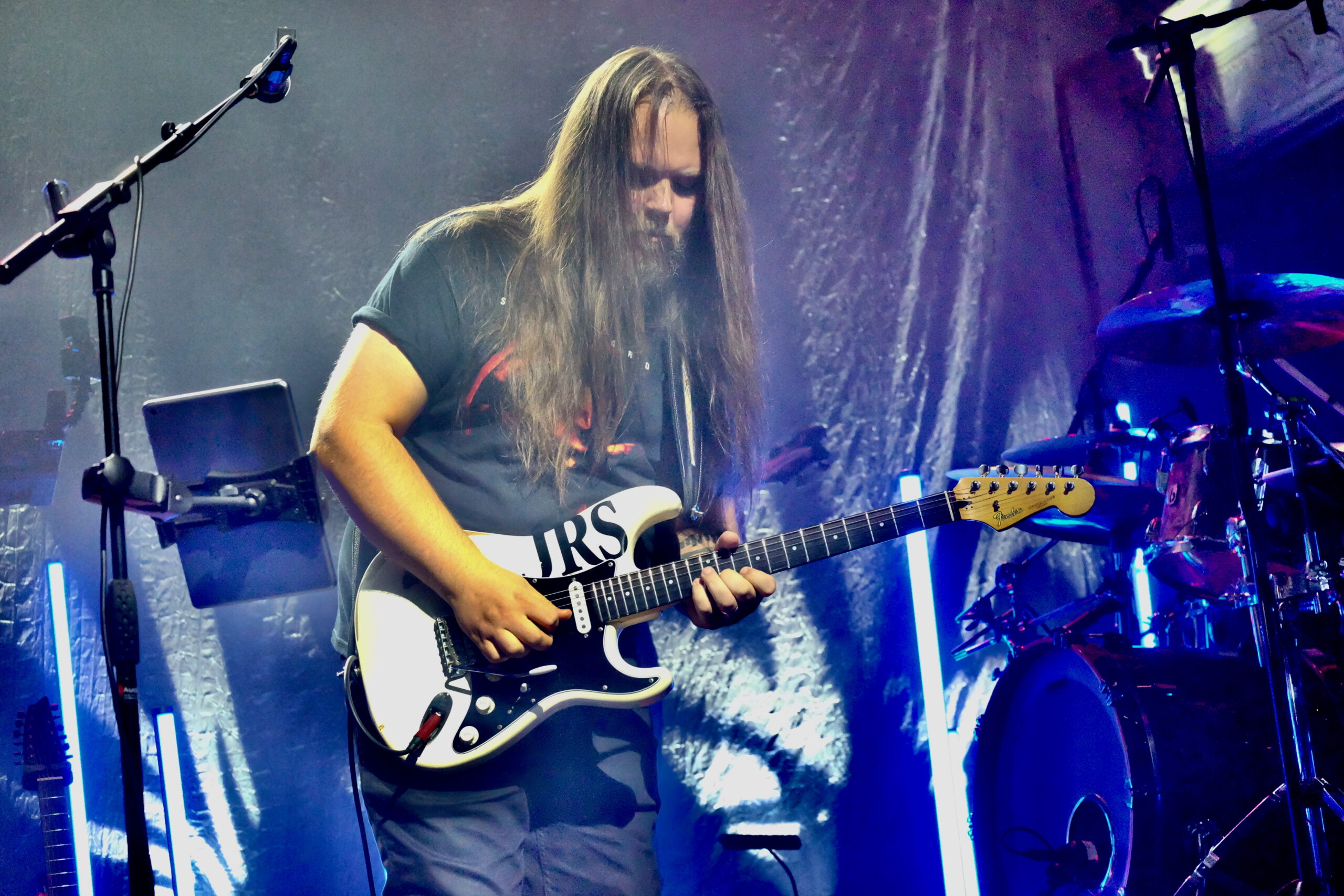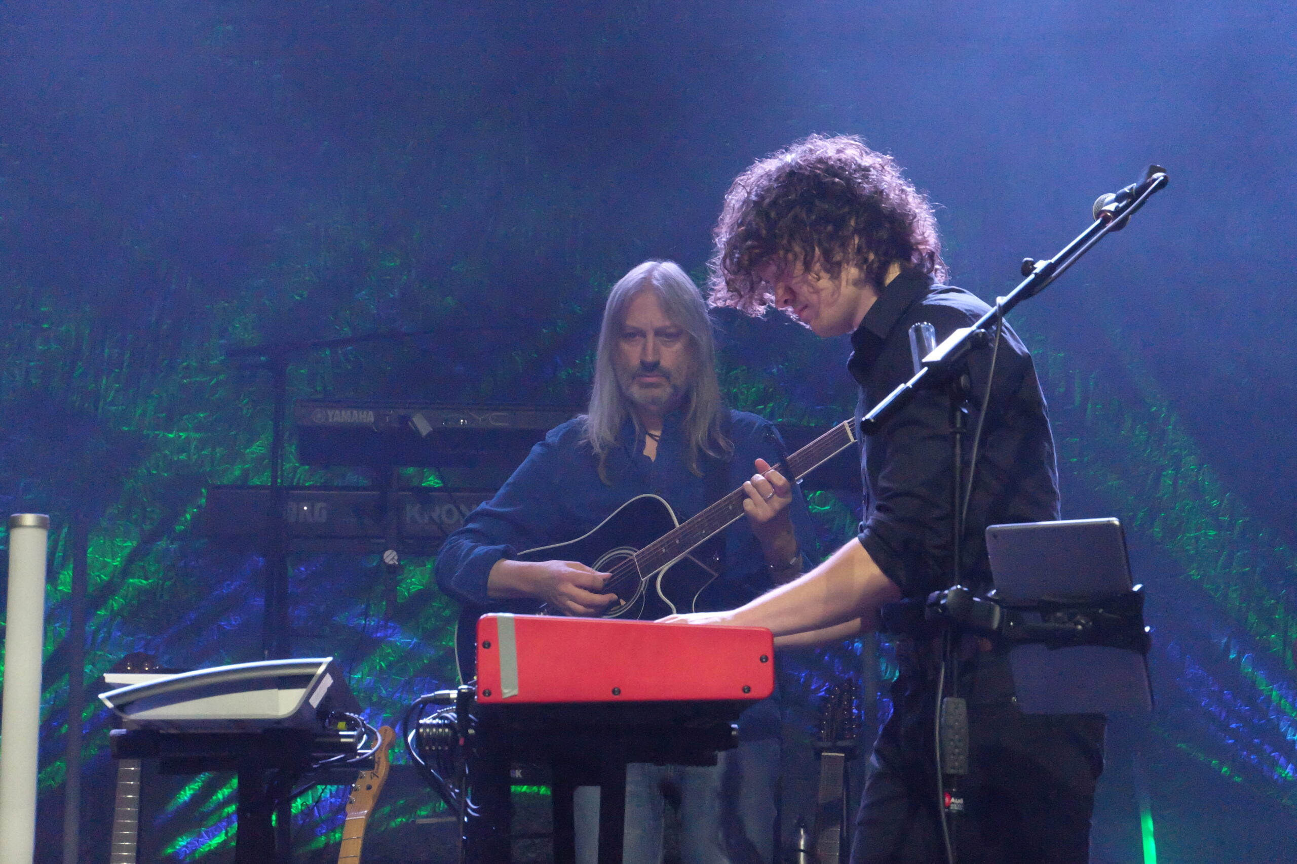This is probably a good point to comment on the electric guitars, as this is one of the first of the recent touring cycles where there hasn’t been a dedicated lead guitarist (for a variety of reasons you can read about elsewhere). The majority of lead guitar work therefore falls to Rikard Sjöblom. In the previous BBT shows I have seen, Rikard’s soloing has always been a high point in the (small number) of occasions – so getting more of that is a major bonus … and of course he is more than up to the task! With his trusty JRS Strat and the new addition of a glorious white double necked guitar (as much of a prog icon as Greg’s Rickenbacker bass), every part was covered, and at times Alberto and him joined up on harmony guitar parts. The same can be said of Paul Mitchell who is playing trumpet, percussion and adding occasional vocals. The understandable absence of a full brass section, less practical as touring gets more extensive (and presumably expensive) is again something this versatile line up takes in its stride – Paul’s trumpet provides the signature brass element, and other parts are covered by guitars / keys, not just imitating the previous sounds but reworking some of those aspects of the familiar songs.