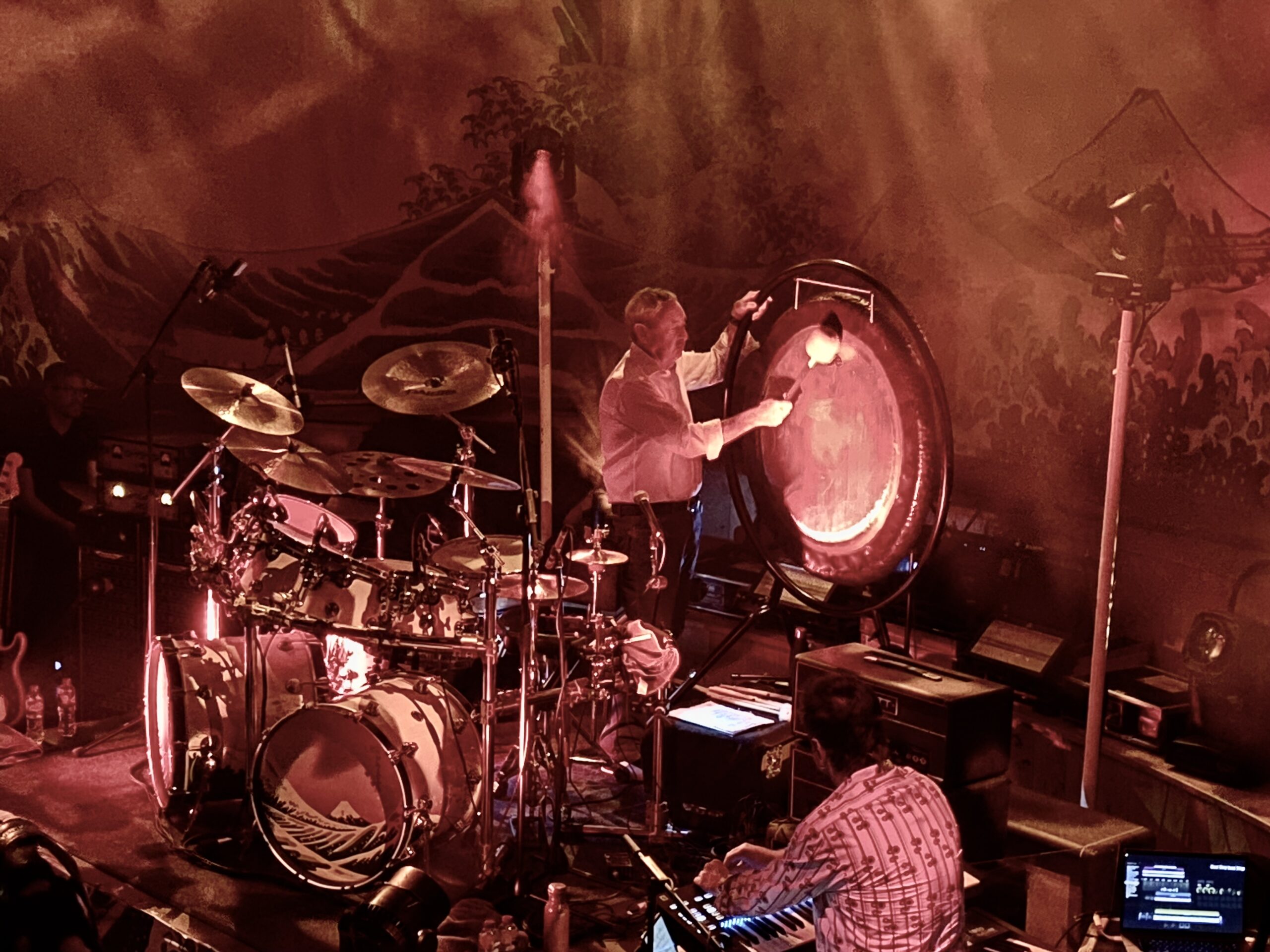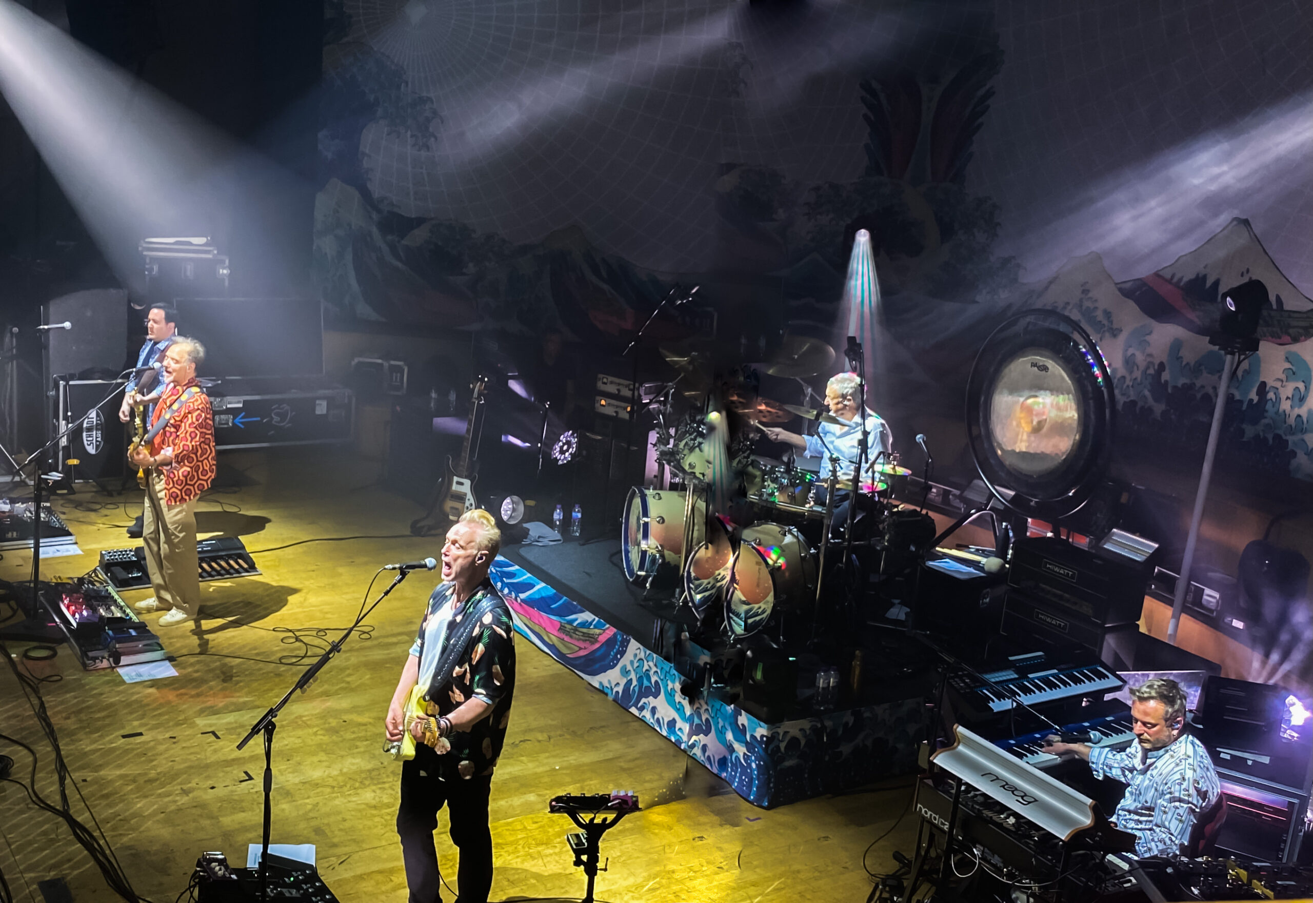 So I completed the set… I’ve seen Roger live twice, David with Rick on keys… so Nick on drums was the missing piece!!! Yes the Saucerful of Secrets band are back on the road, touring for the first time since 2019. If you’ve been living under a rock, I’ll explain that the band came from Mason being approached by guitarist Lee Harris suggesting forming a band that performed the band’s pre-Dark Side of the Moon material. Adding Guy Pratt (Floyd bassist in situ since 1987), Gary Kemp on guitar and vocals plus Wright collaborator Dom Beken, the band got underway and are finally back on the road. The Belfast show was show #2 on a U.K. tour and even before it started we were lured into the world of Floyd. With 3 massive backdrops, a recording of abstract and Floyd related found sounds playing, and a drum kick with double kick drums featuring the iconic Hokusai wave design, we awaited the music. It wasn’t long before the echoing bass guitar of One Of These Days was audible before the band hit the stage a few seconds later – and what a sound! The great thing about SoS is how they embody the spirit of the music without being slavish in copying it. Yes all the main elements are there, but given that improvisation was a big part of the live Floyd experience in those years, that spirit is retained within his SoS present the music. To think of this as the Syd era isn’t actually the case because as much focus is given to album like Meddle, Atom Heart Mother and Obscured by Clouds as it is to the first two. Arnold Layne is up early in the set and is a joy to hear live! A few songs later, a version of its B-side Candy and A Currant Bun appears – talk about deep cuts, made even deeper by reverting to the original “Lets Roll Another One” lyric in the later verses, this is truly one for the fanboys/girls – but what a great song.