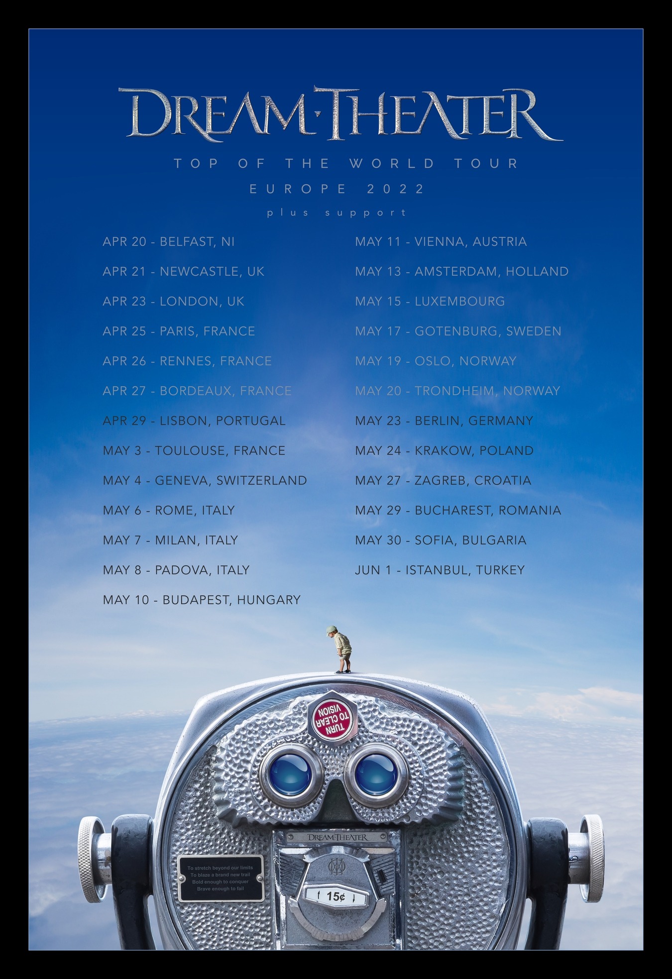 Dream Theater have announced that The Top Of The World Tour of Europe kicks off on 20th of April, 2022 in Belfast, N. Ireland and runs through to the month of June where it concludes in Istanbul, Turkey. The tour will make stops in London, UK; Paris, France; Rome, Italy; Oslo, Norway; Berlin, Germany and more, with additional dates and support to be announced soon. Information on tickets for all upcoming shows as well as VIP packages can be found at www.dreamtheater.net.