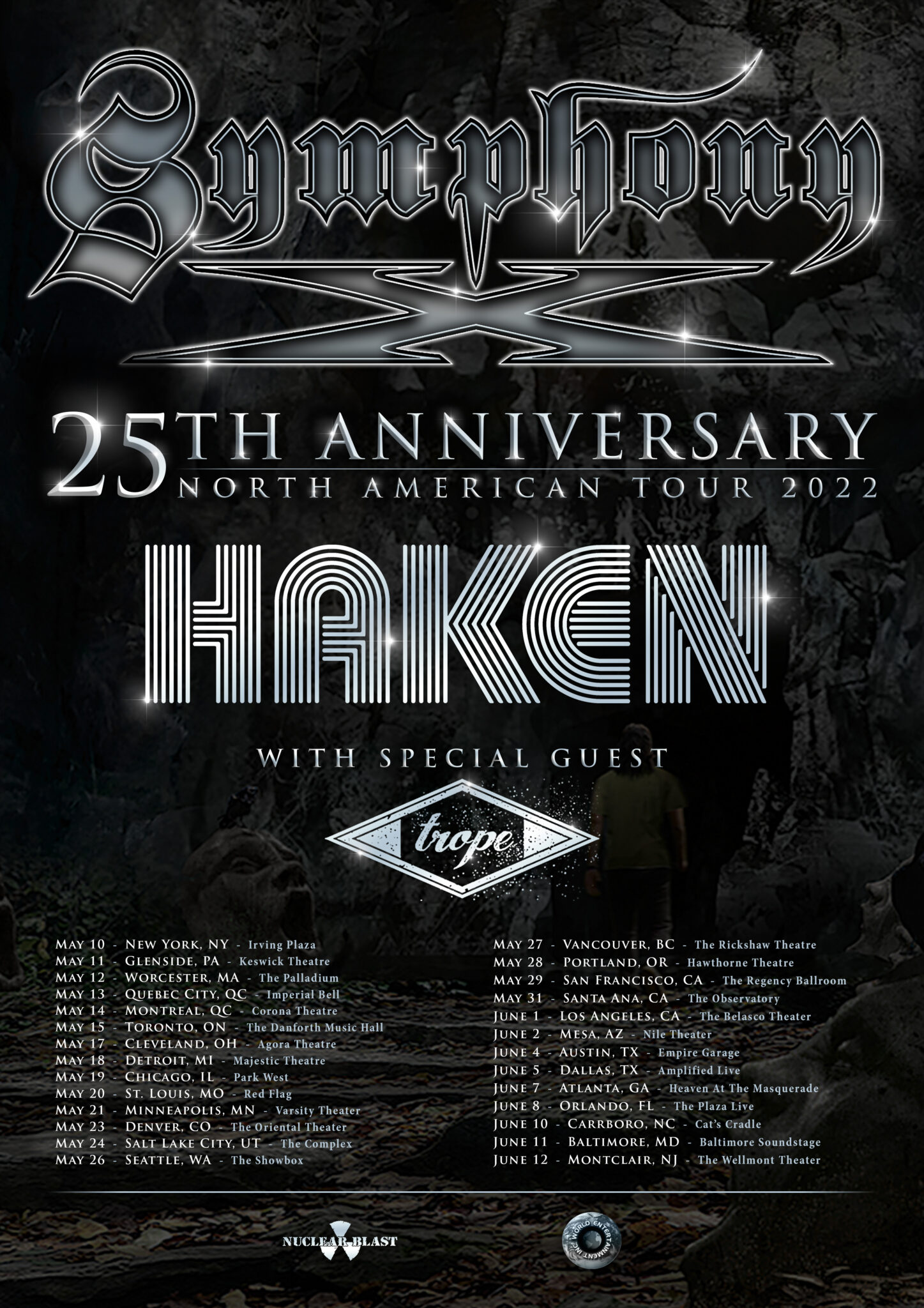 HAKEN is making its much anticipated return to North America, joining prog metal legends Symphony X on a co-headlining tour in 2022. Symphony X are celebrating their 25th anniversary! Trope will also be on the tour as opening act.