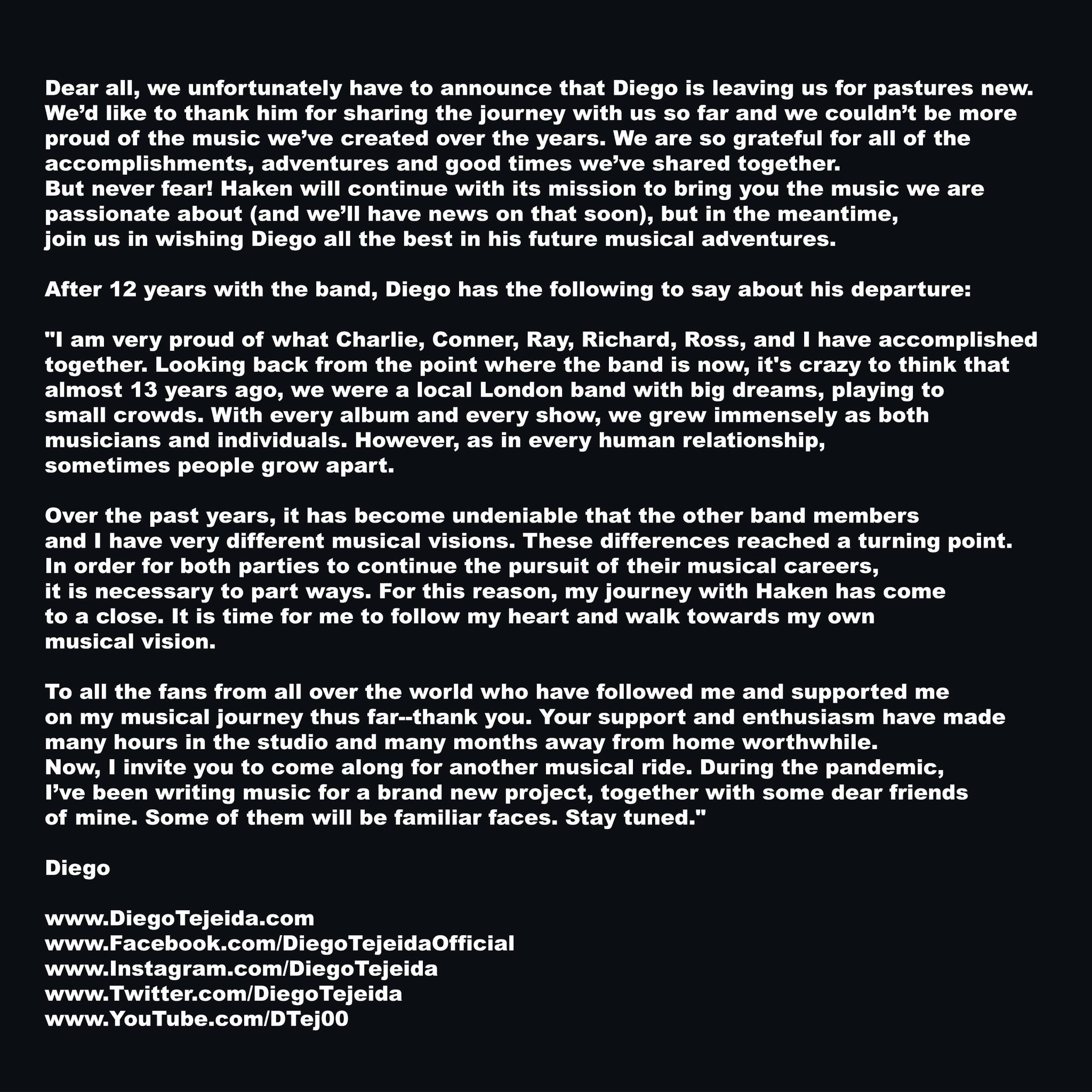In a statement on Facebook on Monday, Nov 22nd, Haken and keyboardist Diego Tejeida have parted ways.