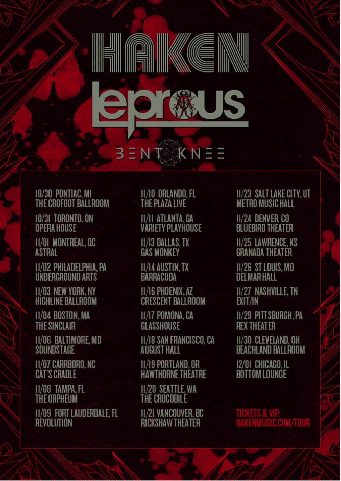 HAKEN comment: “We’ve been talking about getting out on the road with our good mates Leprous again since our European jaunt with them back in 2014. Both our bands have gone from strength to strength in terms of our live shows since then, and we’re excited to see what they have planned, as well as playing brand new music from our forthcoming album. We’re also stoked to have Bent Knee along with us. It sure to be an epic night of music, don’t miss it!”