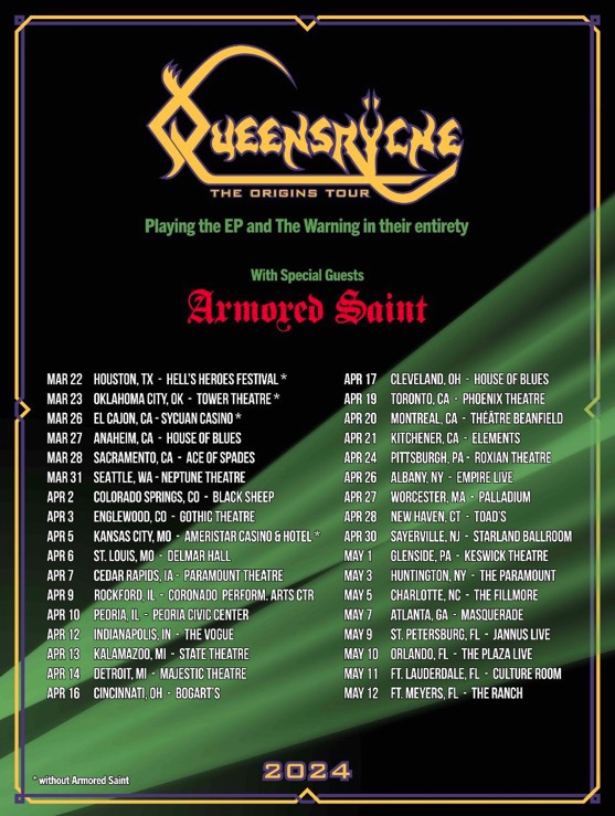 Launching on March 22, 2024 in Houston, TX at Hell’s Heroes Festival and running until May 12 in Ft. Meyers, FL, ‘The Origins Tour’ will see Queensrÿche – singer Todd La Torre, guitarists Michael Wilton and Mike Stone, bassist Eddie Jackson, and drummer Casey Grillo – joined on most dates by another highly respected/influential band that also launched in the ’80s, Armored Saint.