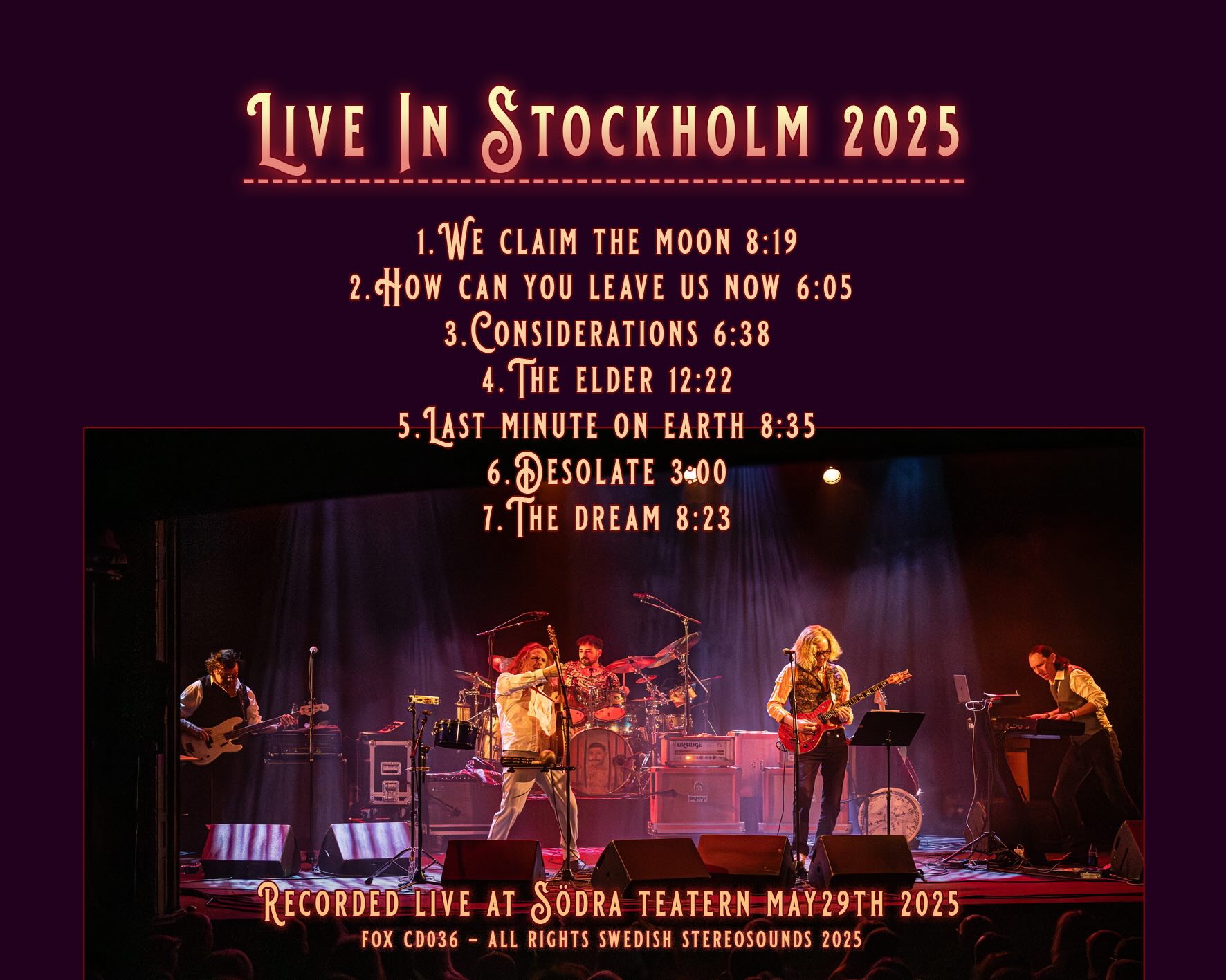 One of the things that makes Live in Stockholm 2025 (and their previous live album, Live in Europe 2023) such a good album and has kept the older album in high rotation for me for over a year and a half, is that the songs are not just recreated studio versions but they have something extra, a presence that isn’t always in the studio. The players, as always, are top-notch. This edition of the Flower Kings is still fronted by guitarists and singers Roine Stolt and Hasse Fröberg, and ably supported by Michael Stolt on bass, Mirko DeMaio on drums and Lalle Larsson on keys. The band delivers each of the songs with power and precision, featuring standout moments from just about every member of the band.